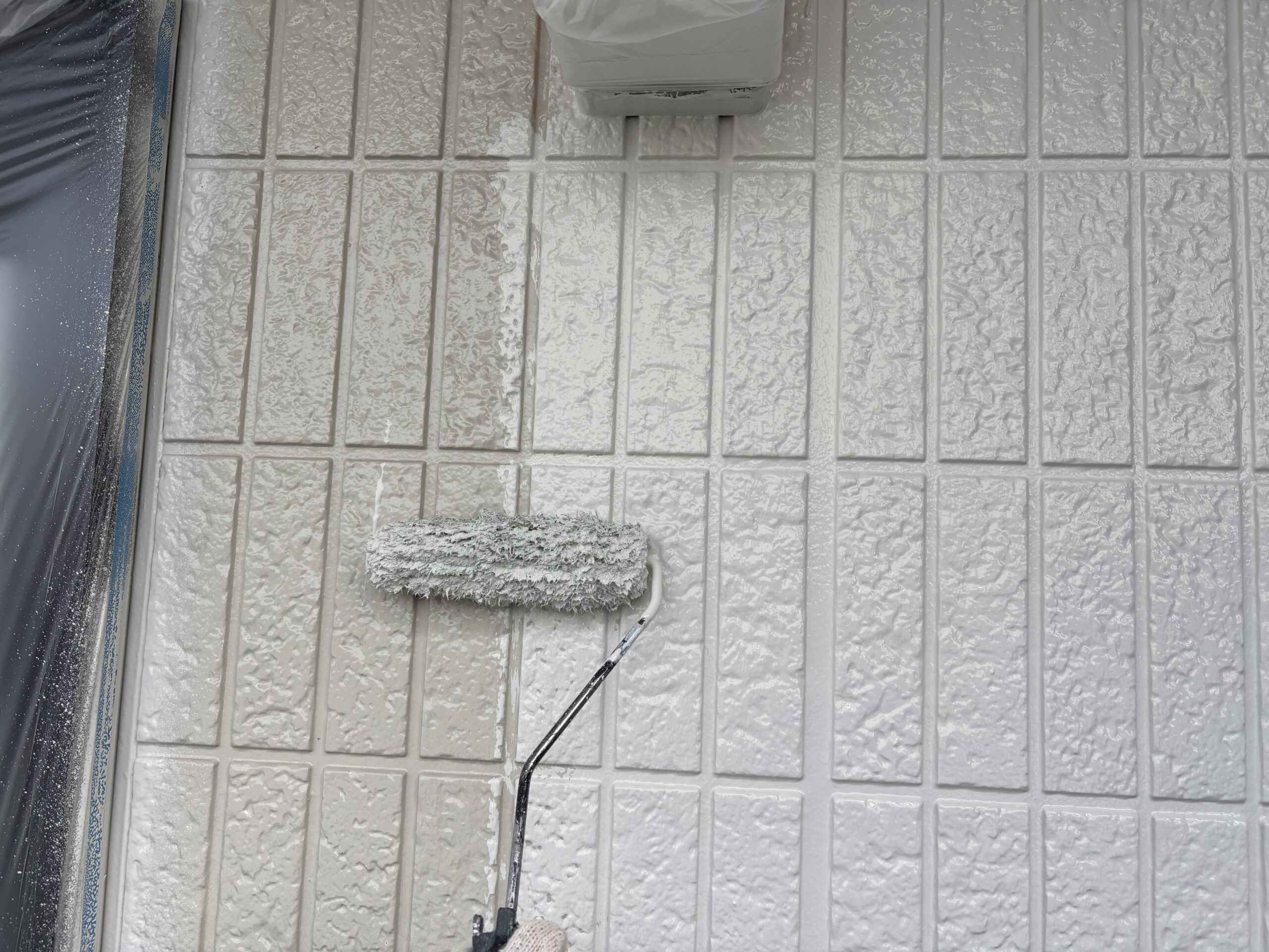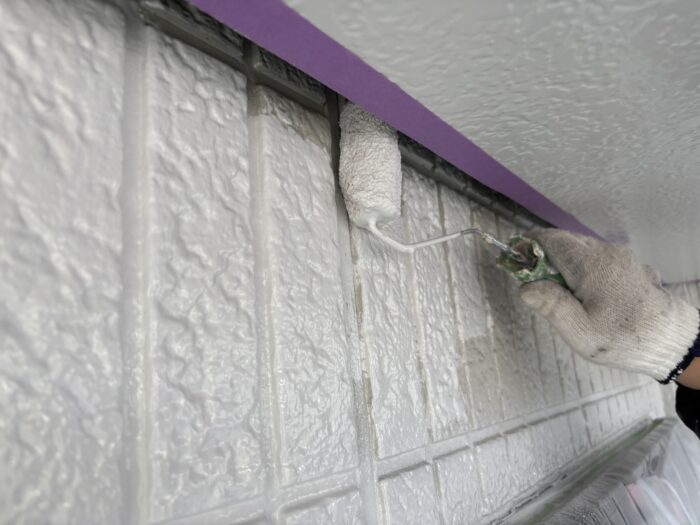 外壁 中 上塗り 大牟田市 K様邸 高圧洗浄 外壁塗装 屋根塗装 2025.12.13 狭い部分は小さいローラーで塗ります。 中塗り ラジカル制御型塗料 コストパフォーマンスの高い塗料です。 上塗り2回塗りが標準施工です。