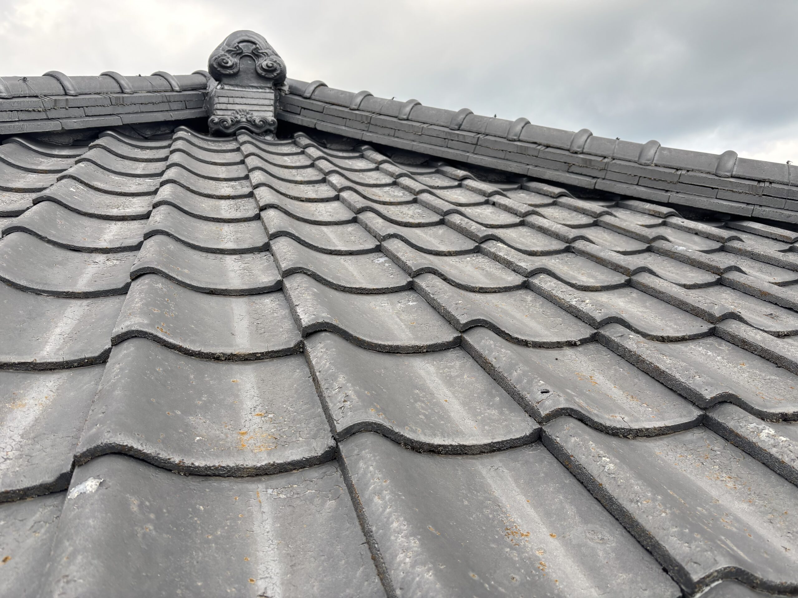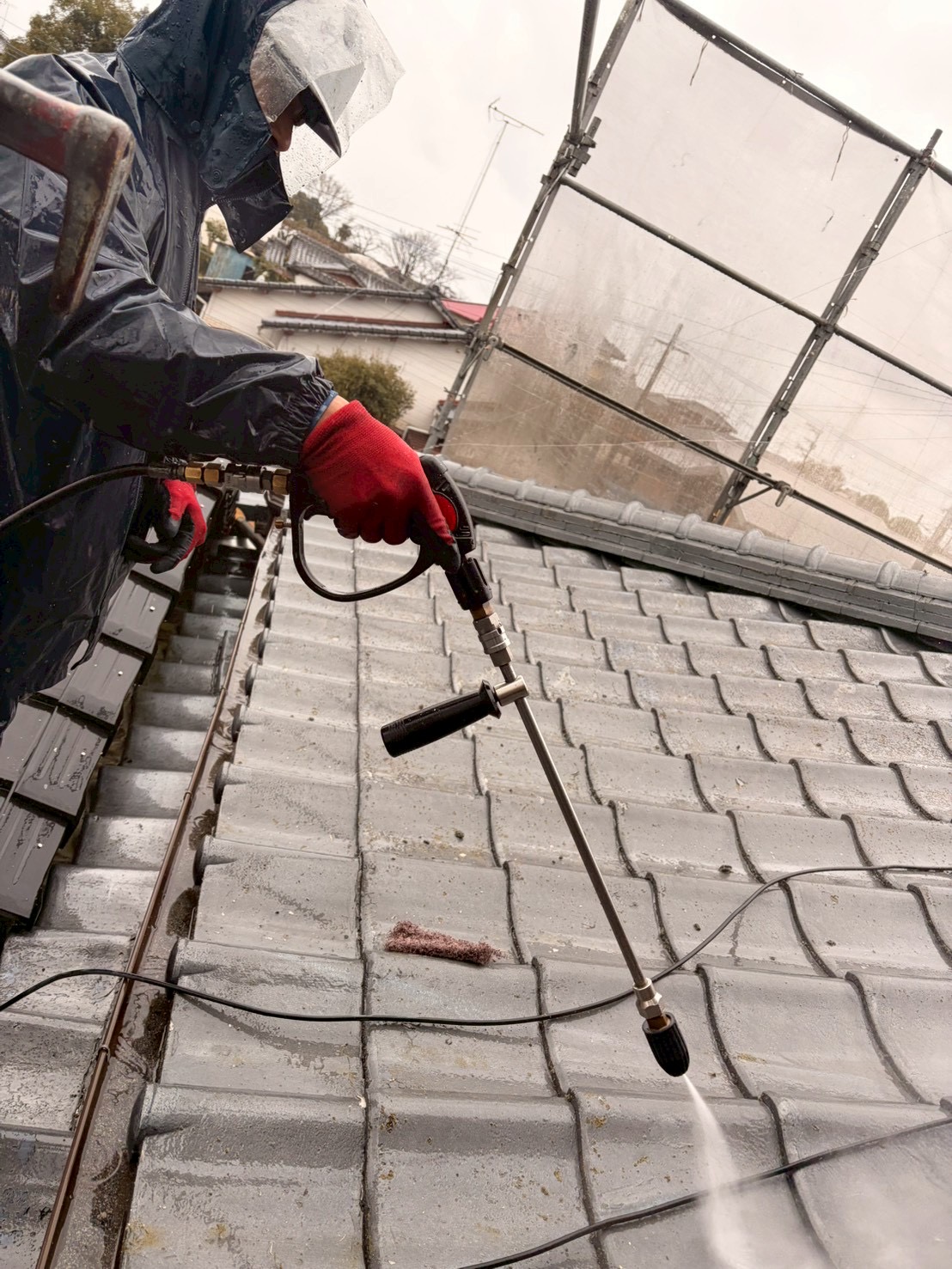 高圧洗浄 屋根塗装 施工事例(玉名郡長洲町 U様邸) 施工中 瓦塗装 高圧洗浄 屋根塗装 玉名郡長洲町U様邸 瓦シリコン塗装 剥離が見られたので高圧洗浄やケレンで下地調整をしてシーラー、フィラー、上塗り2回で仕上げていきます。